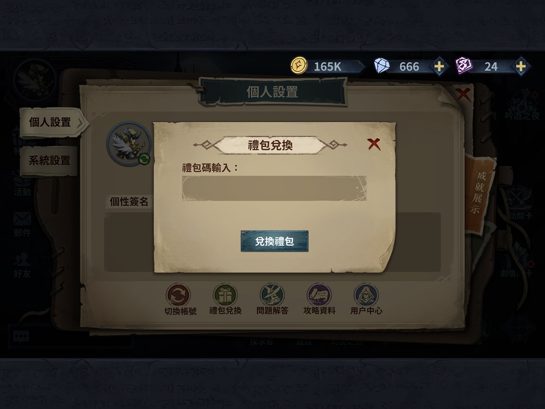 A:進入遊戲後,選擇左上頭像→【個人設置】選項,點選【禮包兌換】,輸入虛寶序號兌換成功後,獎勵將透過郵件送達,請玩家們留意查收,並保持遊戲內郵件不定時整(清)理。