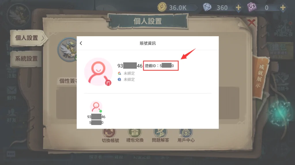 ●查詢遊戲ID的方法如下,點擊遊戲主界面左上人物頭像>【個人設置】>【用戶中心】>【帳號資訊】,即可查看角色【遊戲ID】。