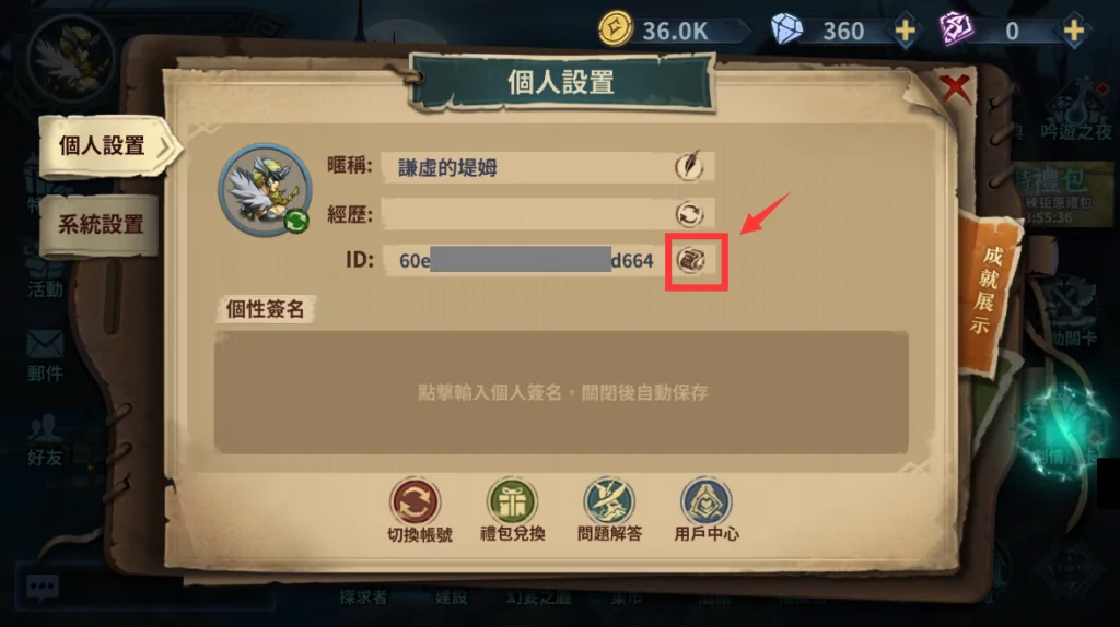 ●查詢角色ID的方法如下,點擊遊戲主界面左上人物頭像>【個人設置】>此串ID亂數即為【角色ID】,可點擊右側按鈕進行複製。